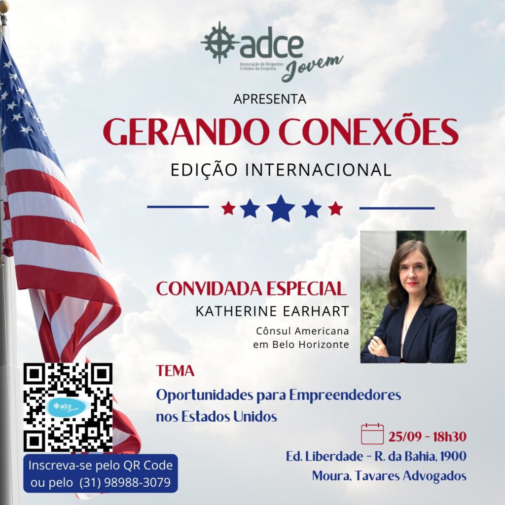 A ADCE Jovens apresenta o “Gerando conexões” – Edição Internacional. O tema será Oportunidades para Empreendedores nos Estados Unidos, e contará com a participação da convidada especial, Katharine Earhtart, que é Consul Americana em Belo Horizonte. O evento vai acontecer no dia 25/09, às 18h30, no Edifício Liberdade, Rua da Bahia, 1900.